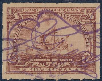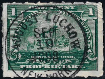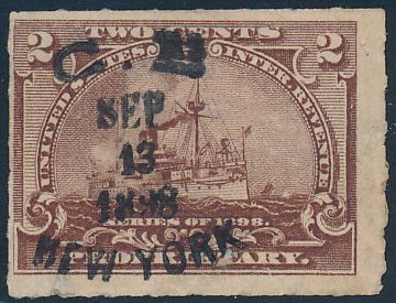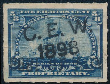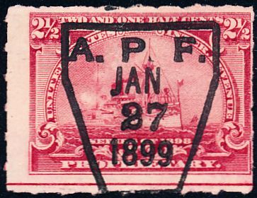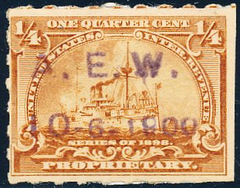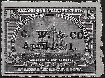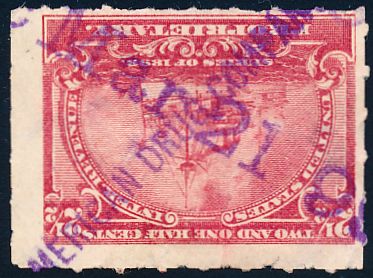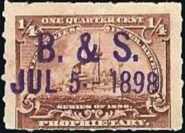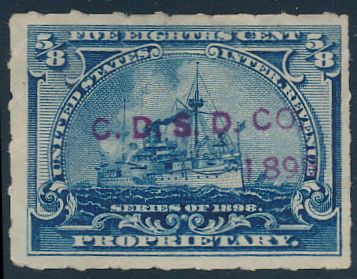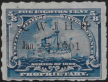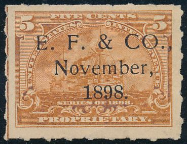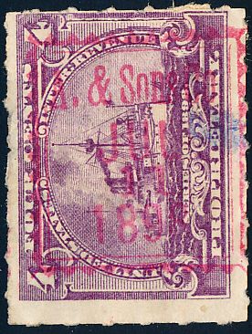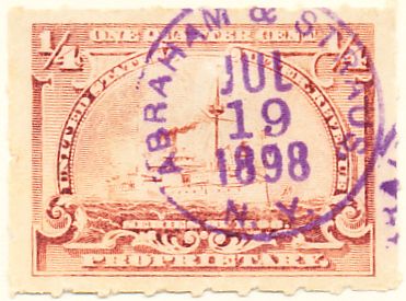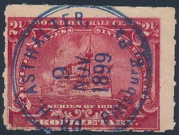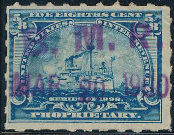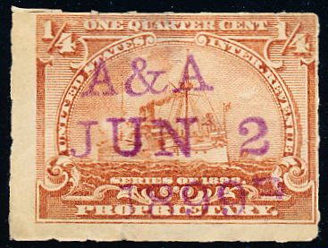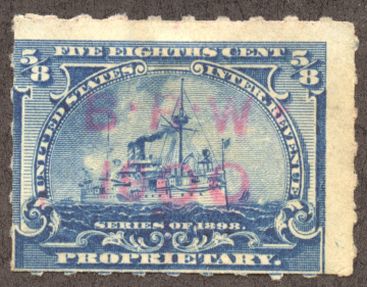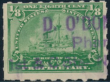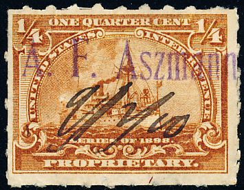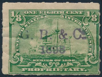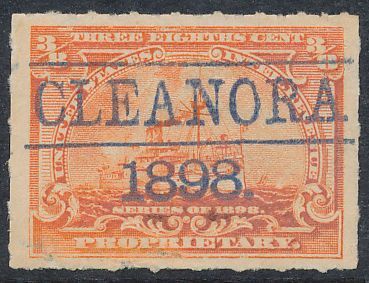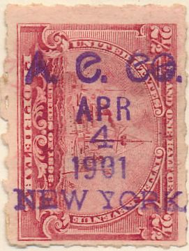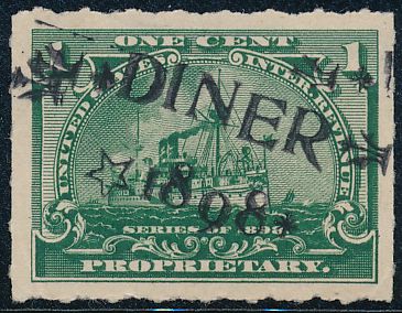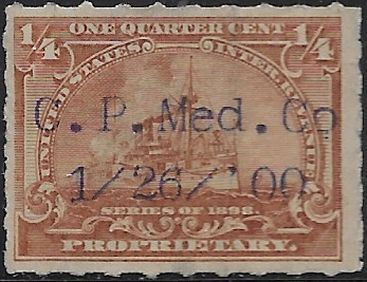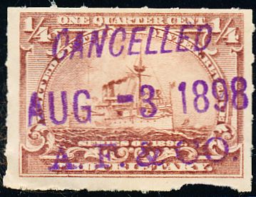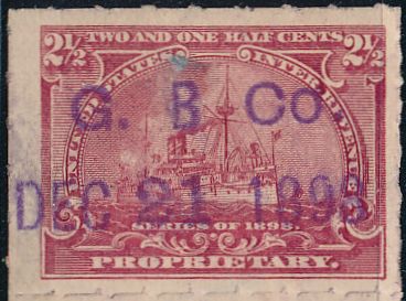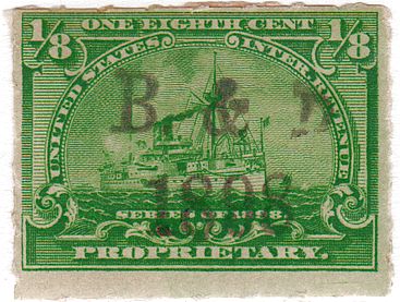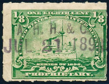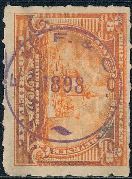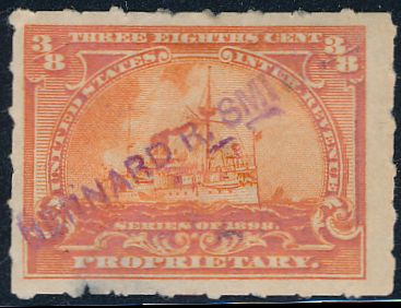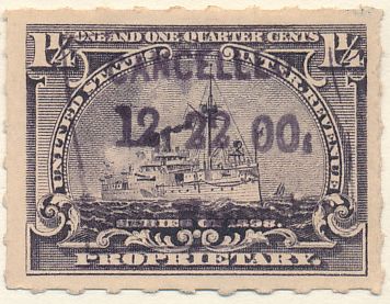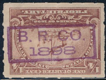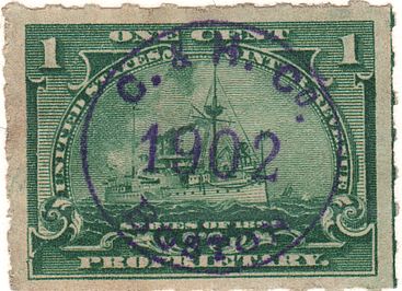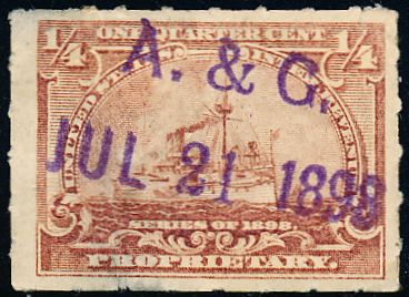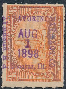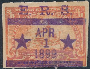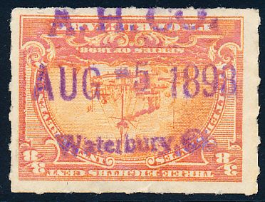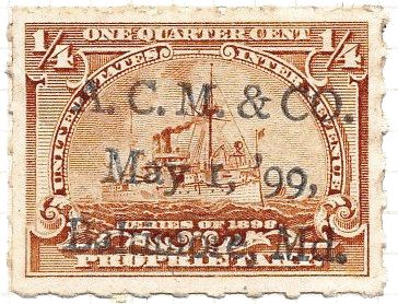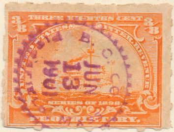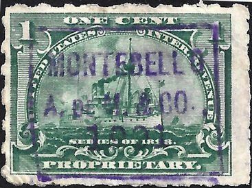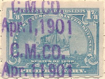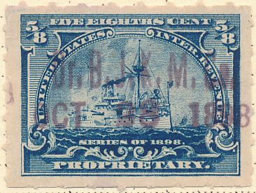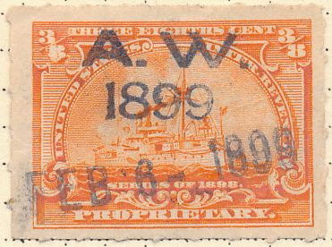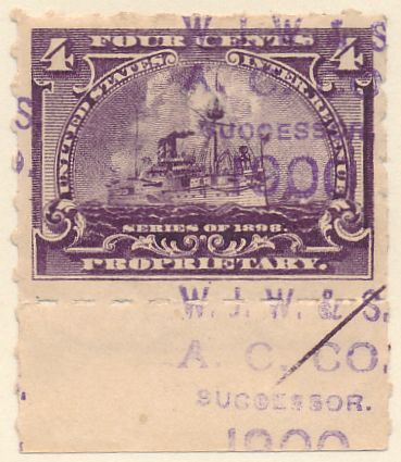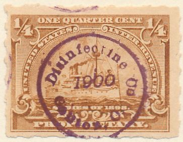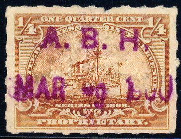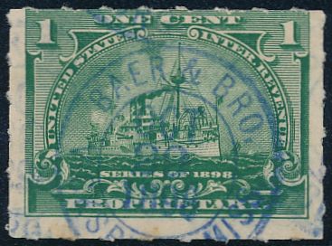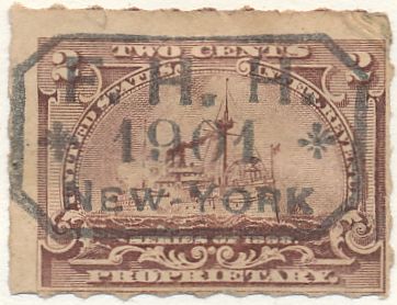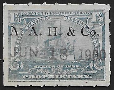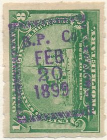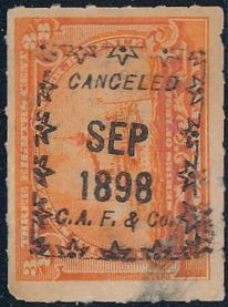 According to the 1898 tax legislation, "in any and all cases where an adhesive stamp shall be used for denoting any tax imposed by this Act, except as hereinafter provided, the person using or affixing the same shall write or stamp thereupon the initials of his name and the date upon which the same shall be attached or used.." Most cancels follow this simple prescription, but many used their full names or a product name. Sometimes locations are also included.